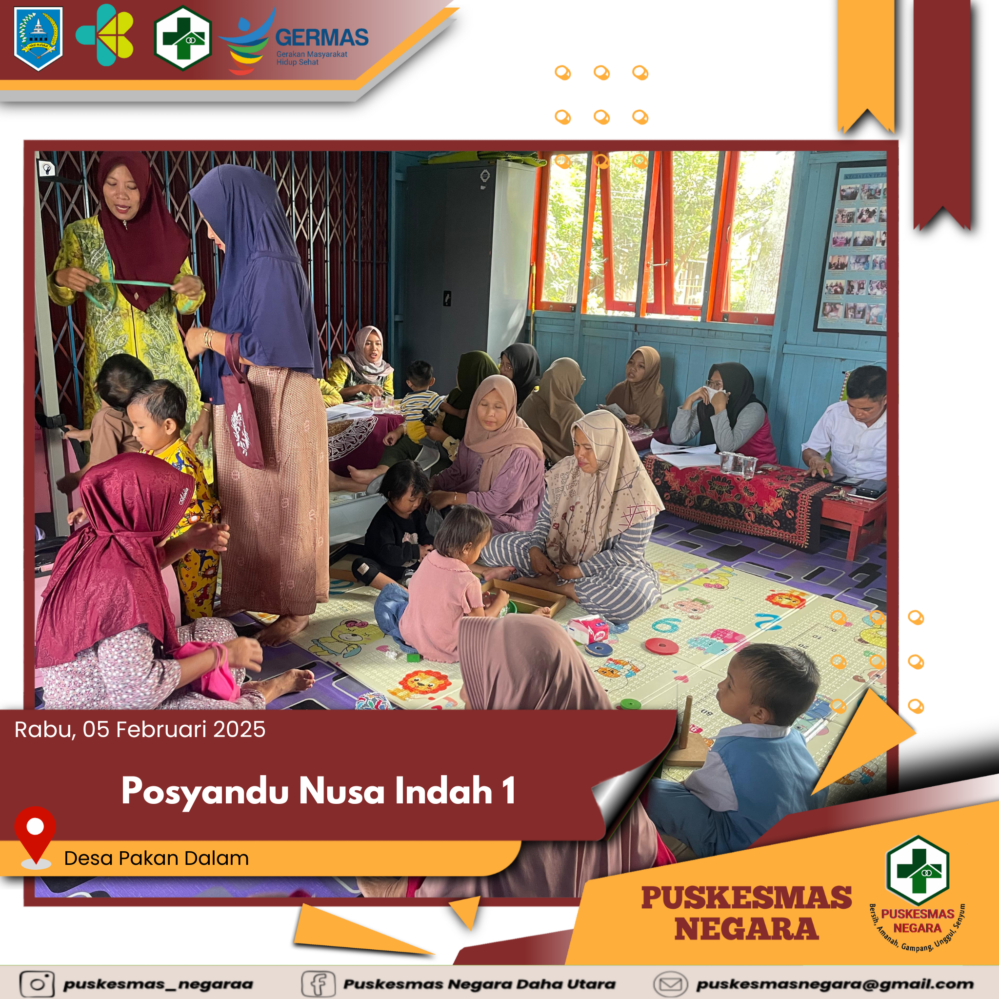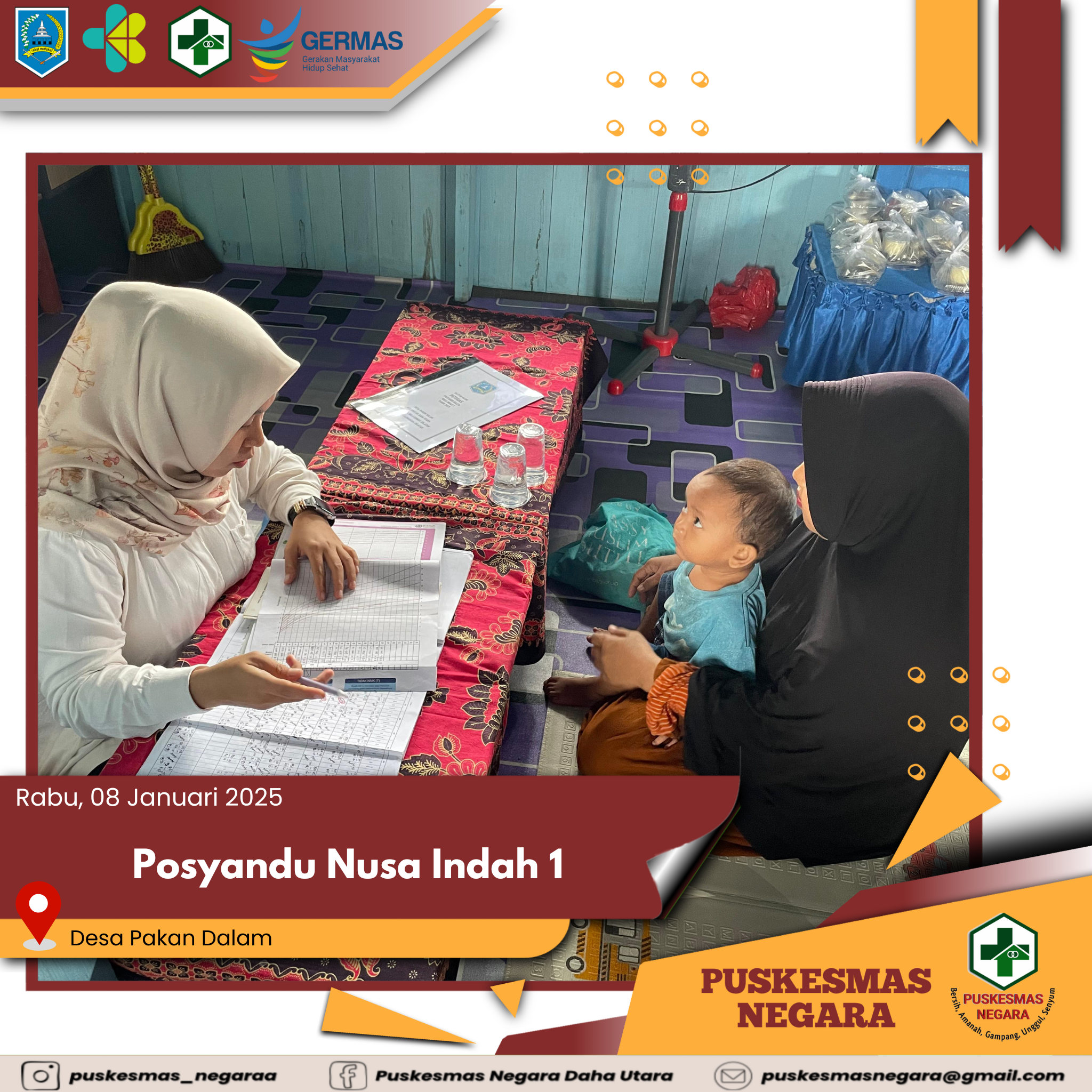 Kegiatan Posyandu Nusa Indah 1 yang dilaksanakan di Desa Pakan Dalam Wilayah Kerja UPTD Puskesmas Negara Kecamatan Daha Utara Kabupaten Hulu Sungai Selatan.