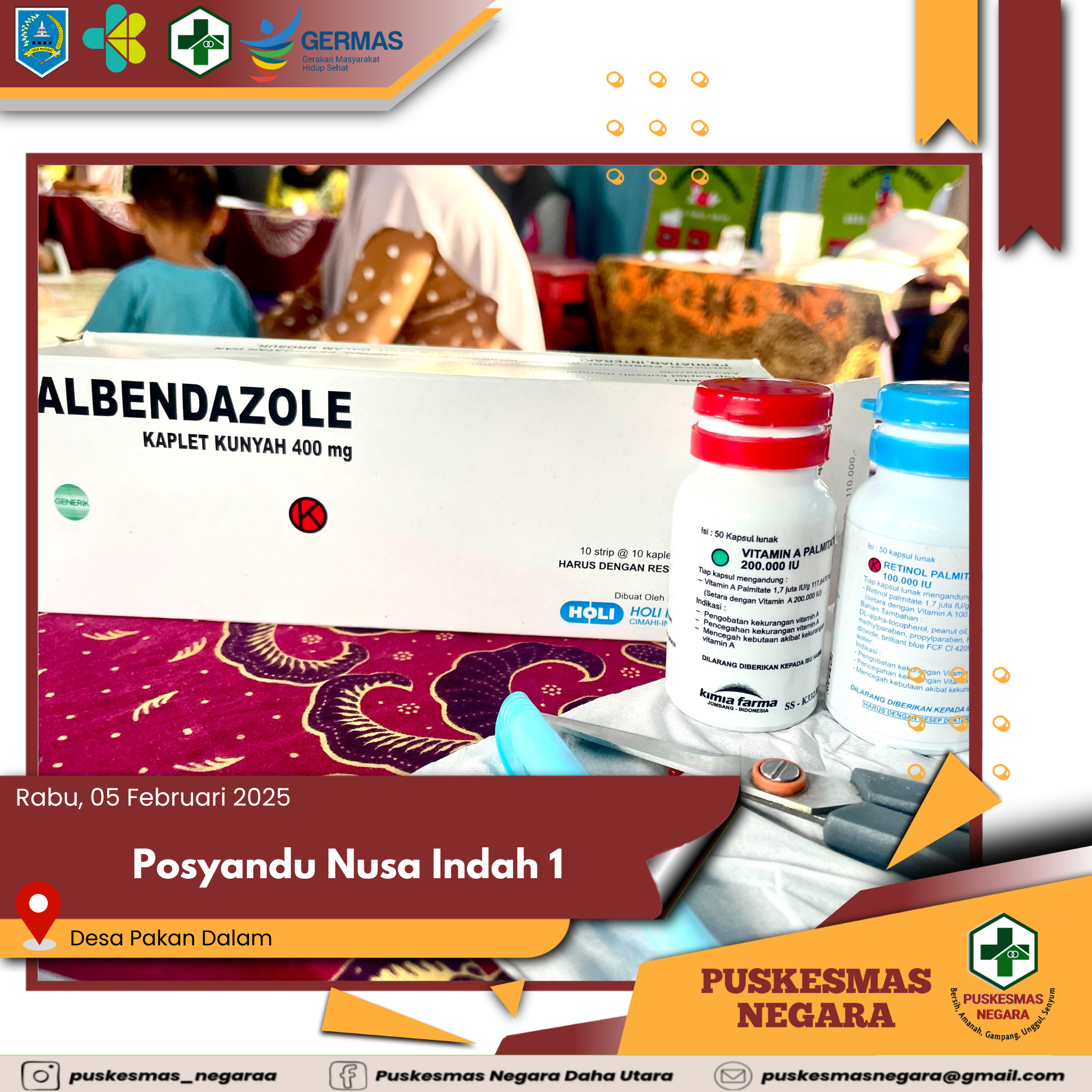 Kegiatan Posyandu Nusa Indah 1 dan Pemberian Vitamin A serta Obat Cacing yang dilaksanakan di Desa Pakan Dalam Wilayah Kerja UPTD Puskesmas Negara Kecamatan Daha Utara Kabupaten Hulu Sungai Selatan.