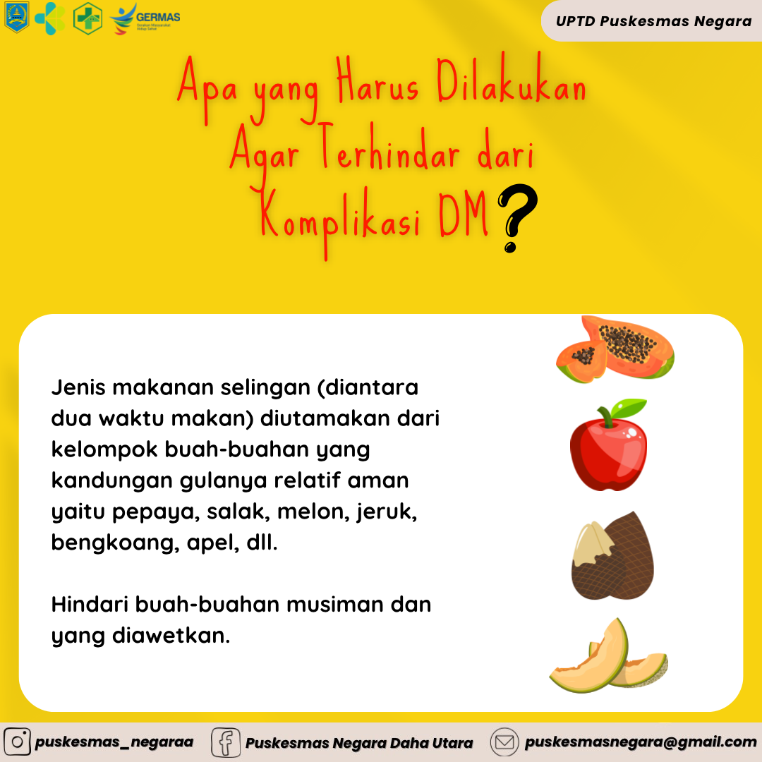 Agar terhindar dari komplikasi DM, kita menghindari buah-buahan musiman dan yang duawetkan. Jenis makanan selingan (diantara dua waktu makan) diutamakan dari kelompok buah-buahan yang kandungan gulanya relatif aman, yaitu pepaya, salak, melon, jerukmp, bengkoang, apel dan lainnya.