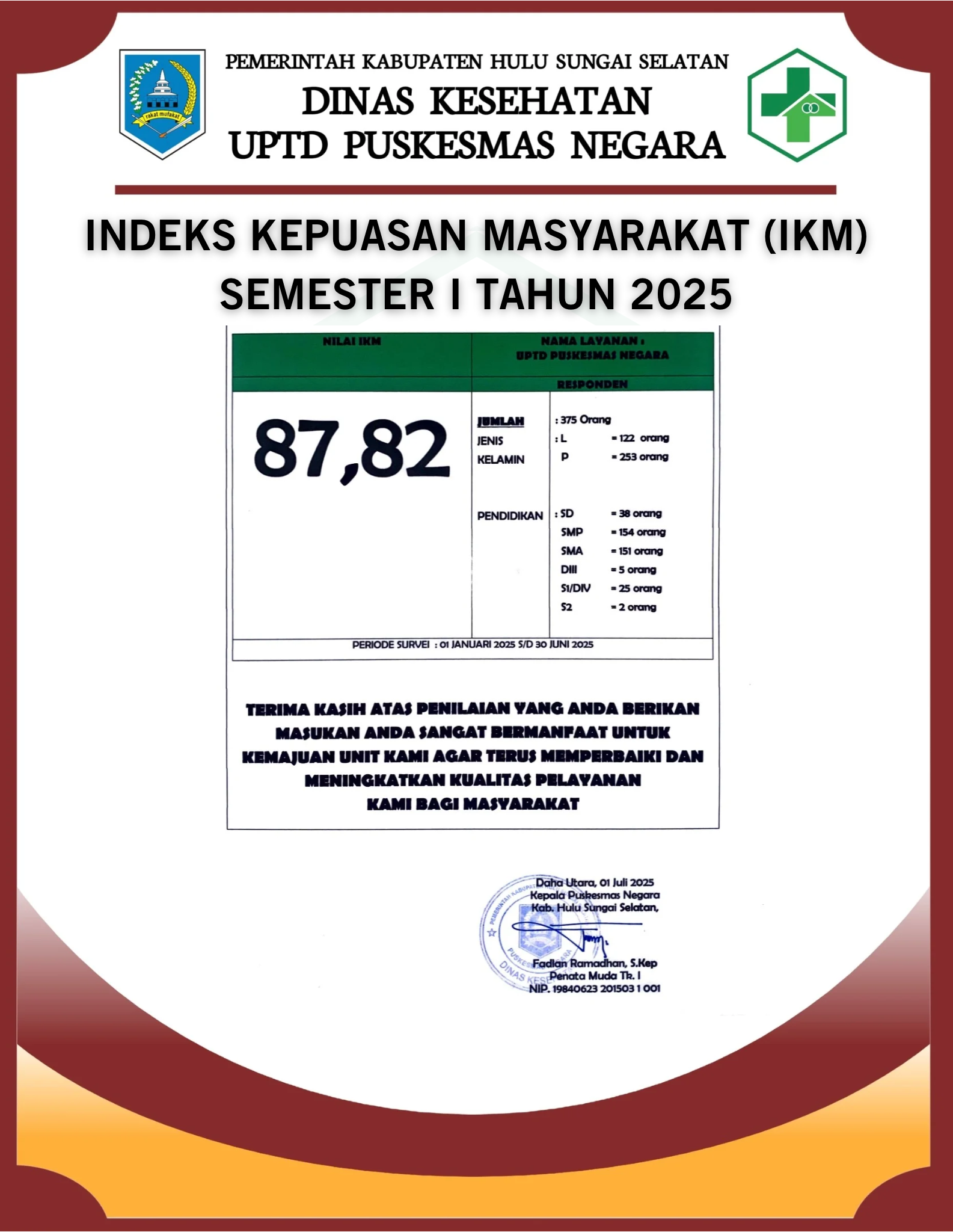 =============================================== Untuk Meningkatkan Kualitas Mutu dan Kinerja Puskesmas Negara, Kriktik dan Saran serta Umpan Balik Masyarakat terhadap Pelayanan Puskesmas Negara dapat disampaikan melalui :