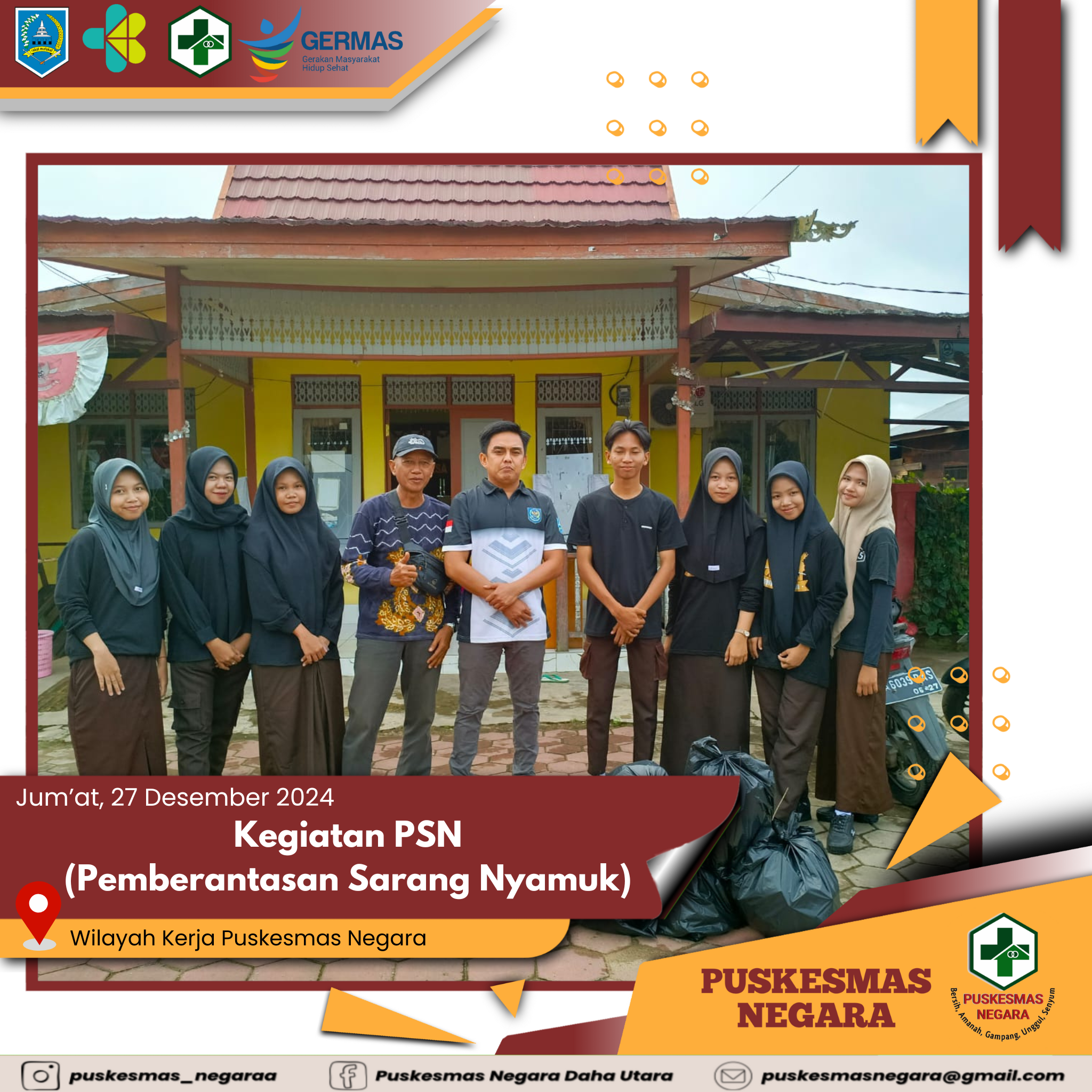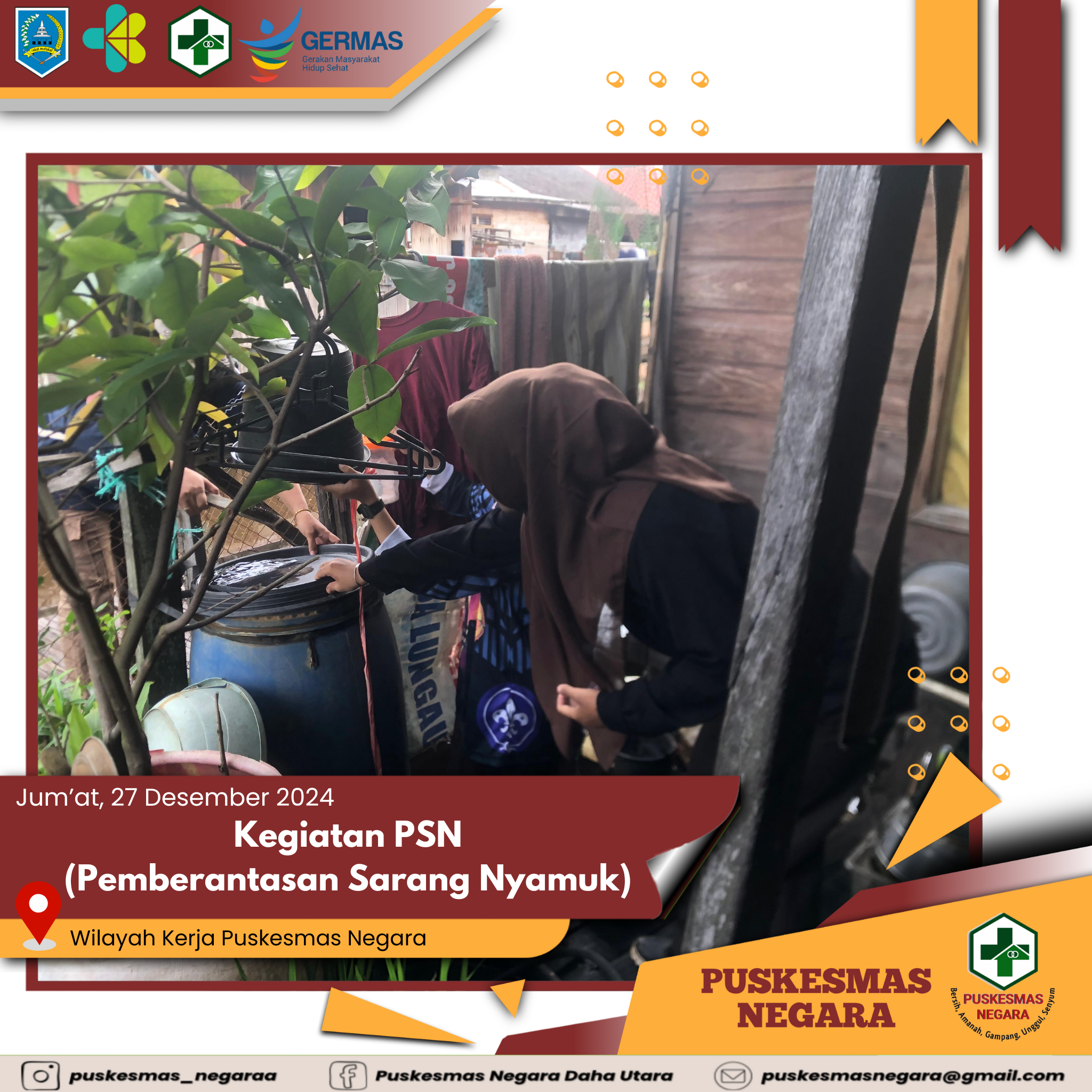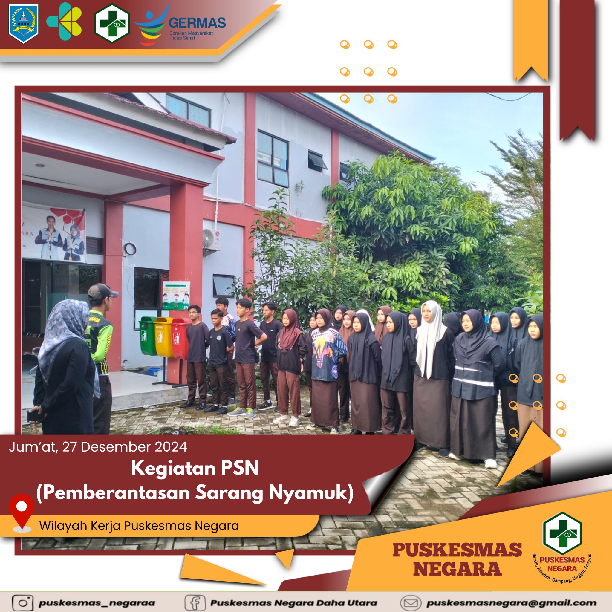 Puskesmas Negara bersama Anggota Saka Bakti Husada (SBH) pangkalan Puskesmas Negara pada hari ini melaksanakan kegiatan edukasi ke masyarakat dan bersama² perangkat desa melaksanakan kegiatan preventif penyakit menular yang sering terjadi di musim penghujan ini yaitu pelaksanaan PSN (Pemberantasan sarang nyamuk). Kegiatan ini dilaksanakan bersama 40 orang anggota SBH Pangkalan Puskesmas Negara bersama tim Puskesmas Negara di 5 (lima) desa yaitu : desa tambak bitin, desa pakan dalam, desa mandala murung mesjid, desa sungai mandala dan desa sungai garuda. Besar harapan kegiatan ini dapat memotivasi masyarakat agar lebih membiasakan pola hidup bersih dan sehat sehingga tidak terjadi wabah penyakit di diwilayah kerja Puskesmas Negara.