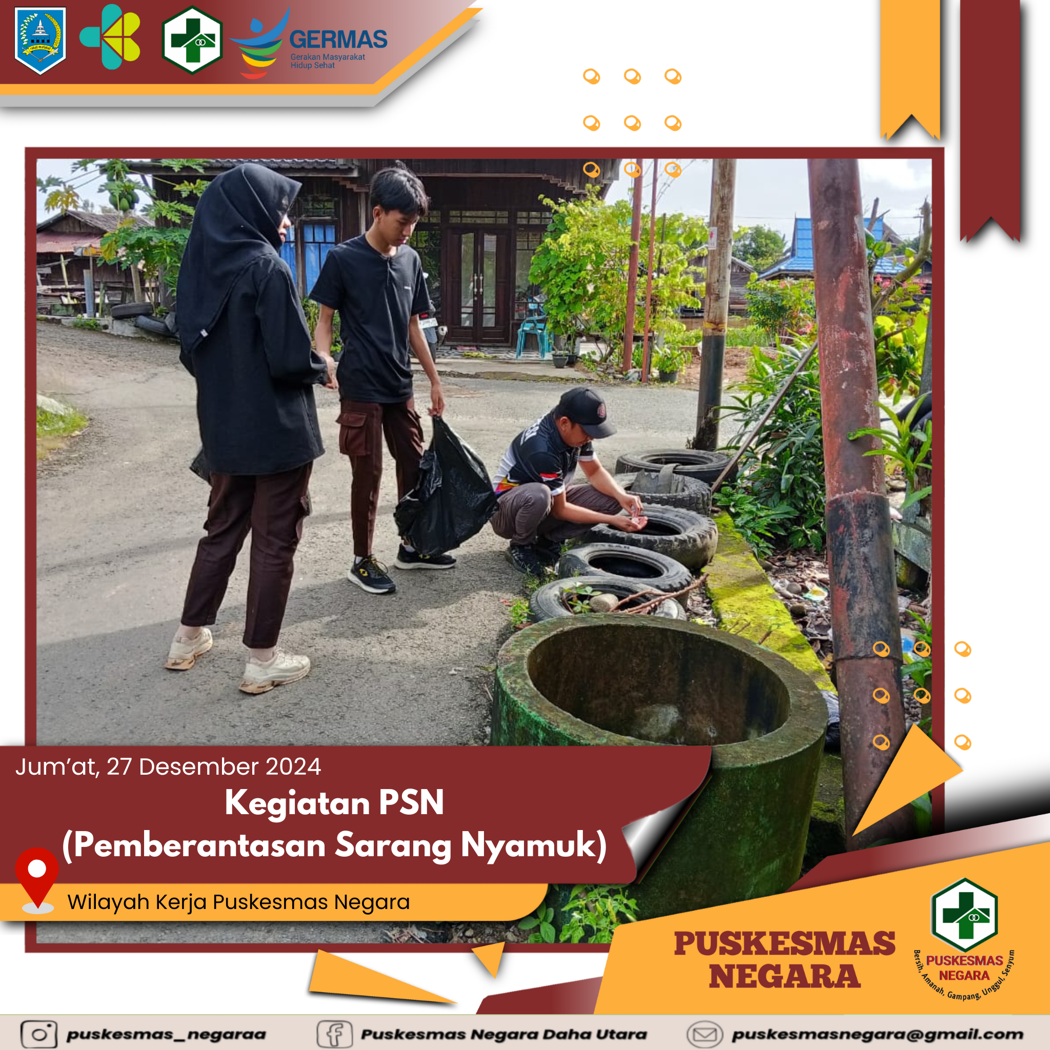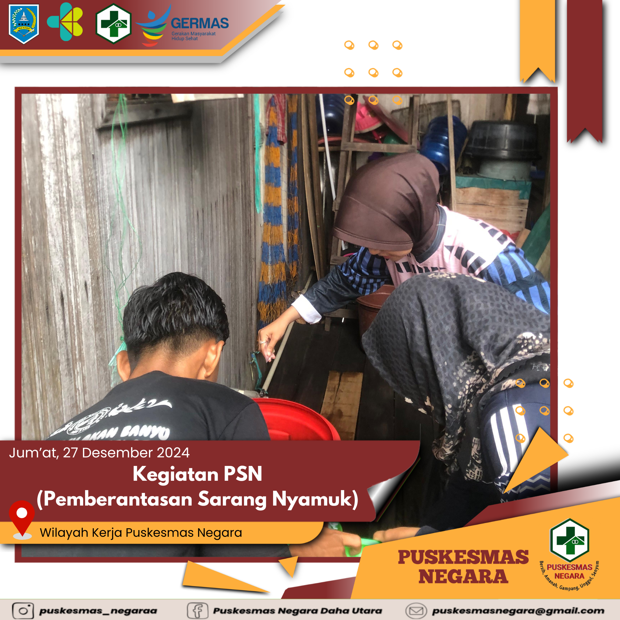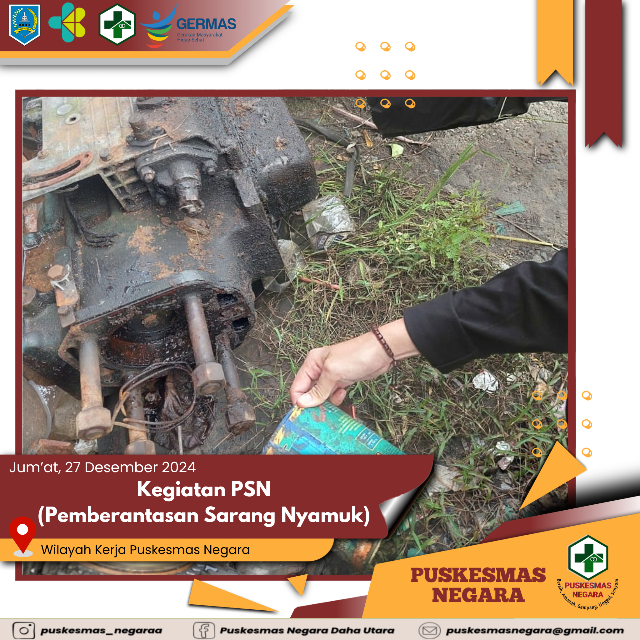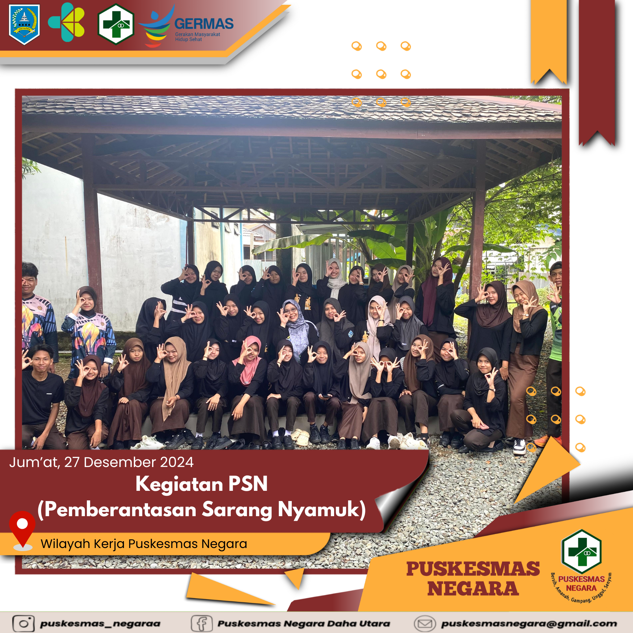 Puskesmas Negara bersama Anggota Saka Bakti Husada (SBH) pangkalan Puskesmas Negara pada hari ini melaksanakan kegiatan edukasi ke masyarakat dan bersama² perangkat desa melaksanakan kegiatan preventif penyakit menular yang sering terjadi di musim penghujan ini yaitu pelaksanaan PSN (Pemberantasan sarang nyamuk). Kegiatan ini dilaksanakan bersama 40 orang anggota SBH Pangkalan Puskesmas Negara bersama tim Puskesmas Negara di 5 (lima) desa yaitu : desa tambak bitin, desa pakan dalam, desa mandala murung mesjid, desa sungai mandala dan desa sungai garuda. Besar harapan kegiatan ini dapat memotivasi masyarakat agar lebih membiasakan pola hidup bersih dan sehat sehingga tidak terjadi wabah penyakit di diwilayah kerja Puskesmas Negara.
