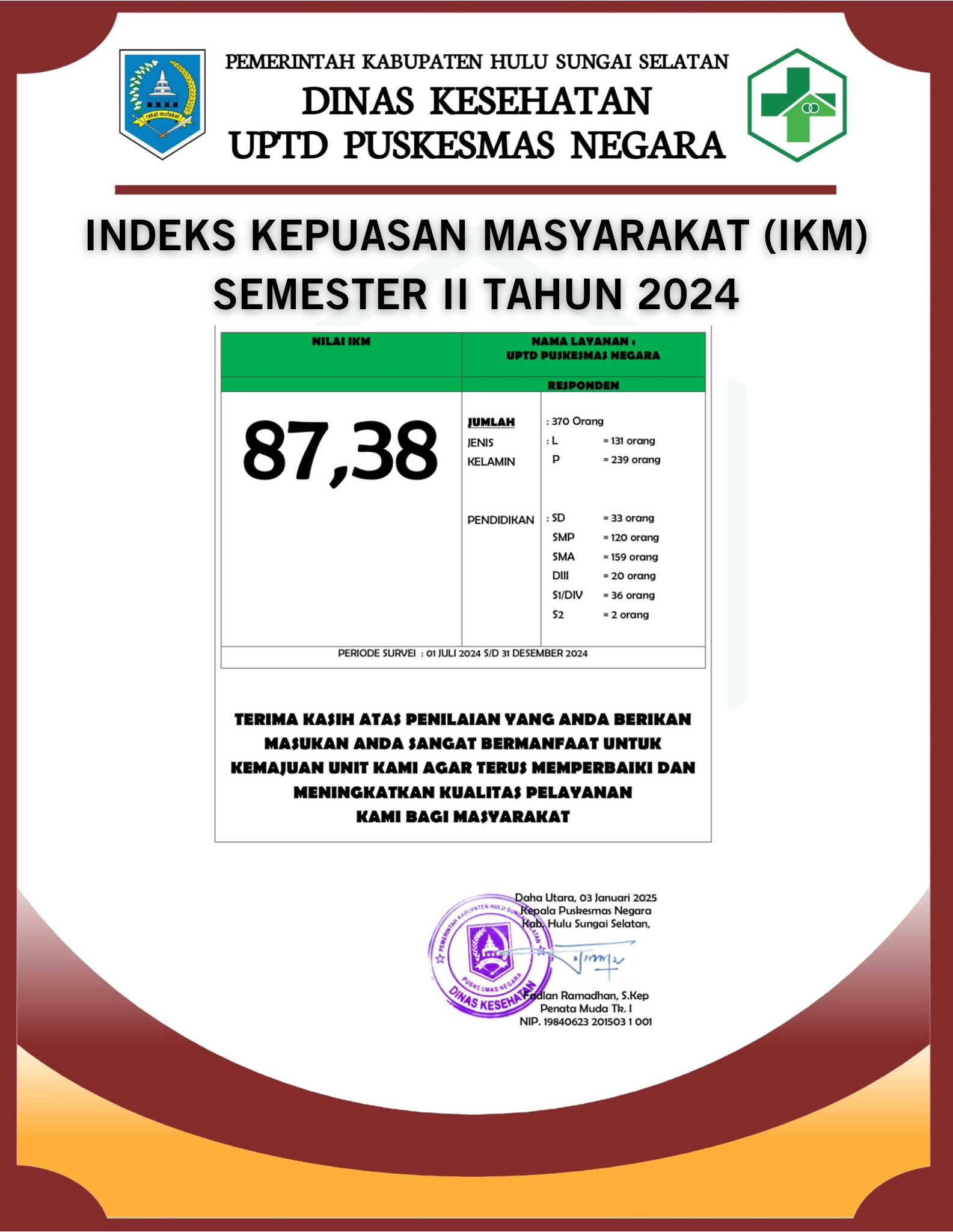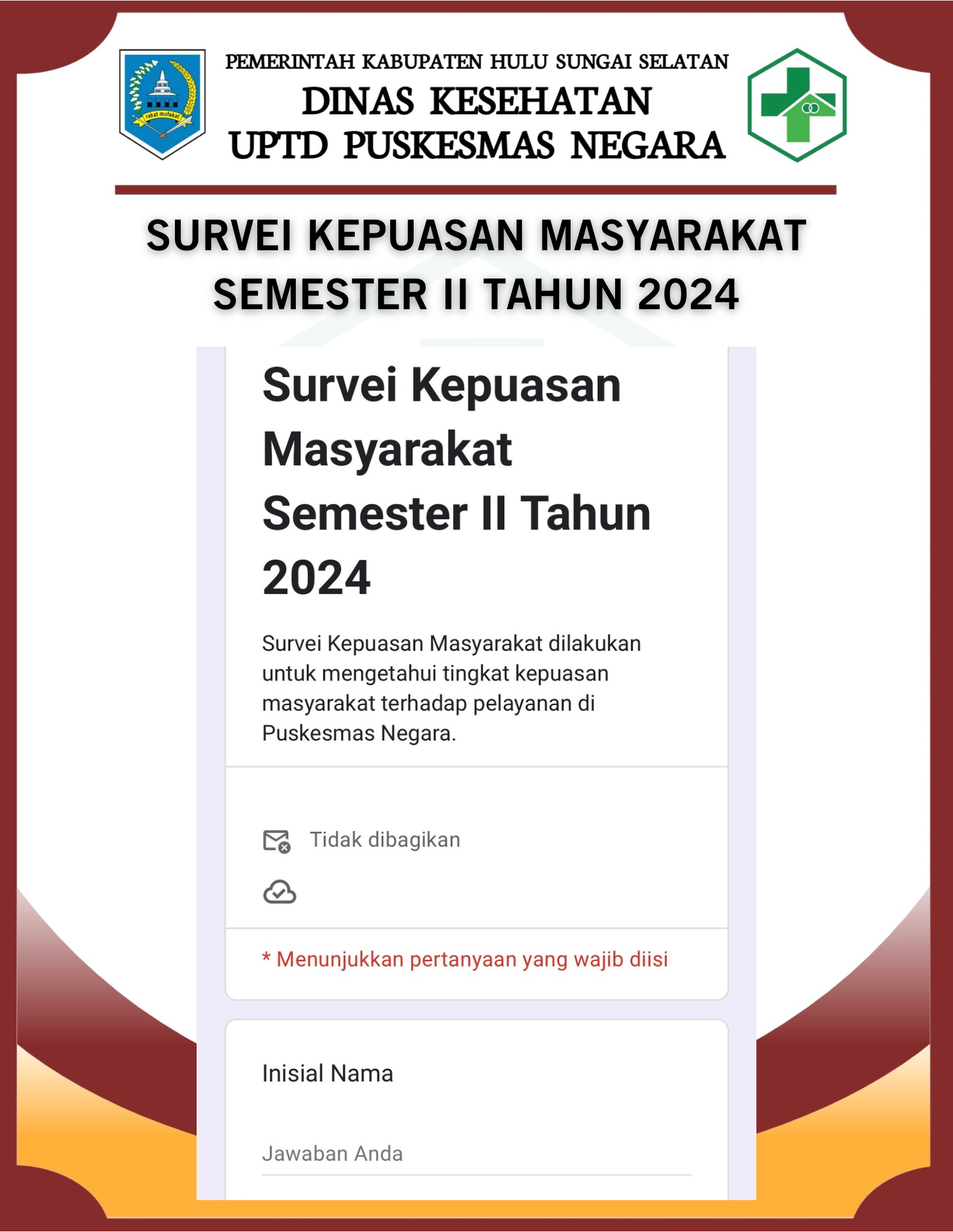 Assamualaikum wr.wb Untuk meningkatkan mutu dan kwalitas kinerja UPTD Puskesmas Negara. Dimohonkan kepada seluruh masyarakat khususnya yang ada di wilayah kerja UPTD Puskesmas Negara dapat memberikan umpan balik penilaian terhadap kinerja UPTD Puskesmas Negara sebagai bahan perbaikan selanjutnya pada link sebagai berikut :
