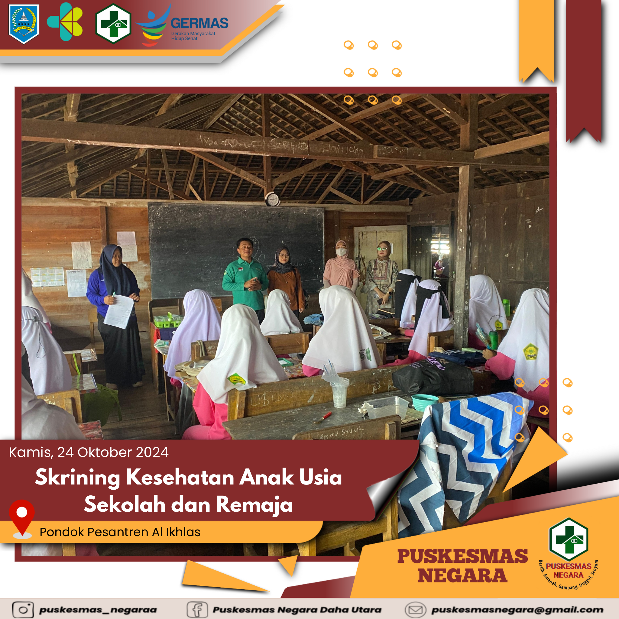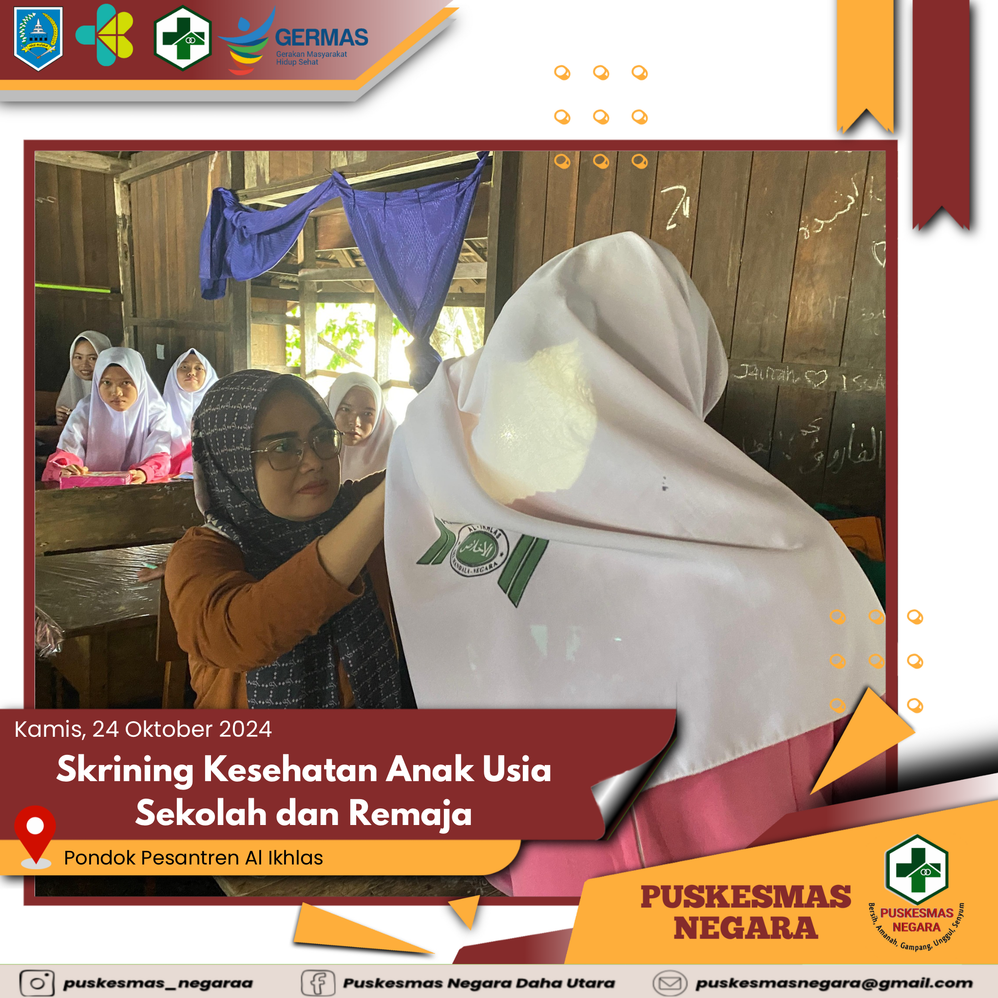 Kegiatan Skrining Kesehatan Anak Usia Sekolah dan Remaja yang dilaksanakan di Pondok Pesantren Al Ikhlas Wilayah Kerja UPTD Puskesmas Negara Kec. Daha Utara Kab. Hulu Sungai Selatan.